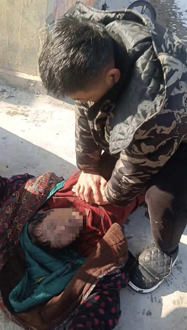由于坡度較陡,工裝男子開始為女子做心肺復(fù)蘇,隨后又有兩人加入救援隊(duì)伍,四人合力將溺水女子抬到坡上的路面。迷彩男子接著為女子按壓做心肺復(fù)蘇。整個(gè)救援過程中,有人及時(shí)撥打了110和120。